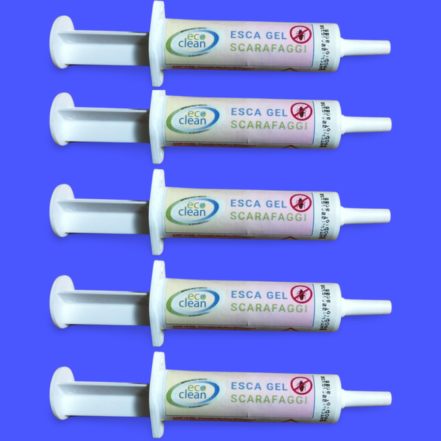 5 Pz. Esca Gel Scarafaggi e Blatte by Eco Clean 5 siringhe da 10g l'una pronto uso, grazie a questo prodotto eliminare i fastidiosi scarafaggi sarà un gioco da ragazzi e facile come non mai oltre al fatto che andremo a trattare in maniera mirata solo gli scarafaggi e le blatte senza dover spruzzare o nebulizzare prodotti in forma liquida o polveri nei locali e negli ambienti da trattare.